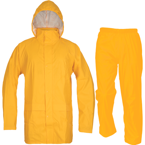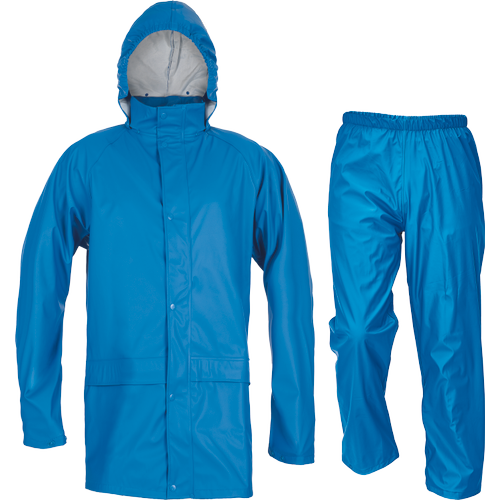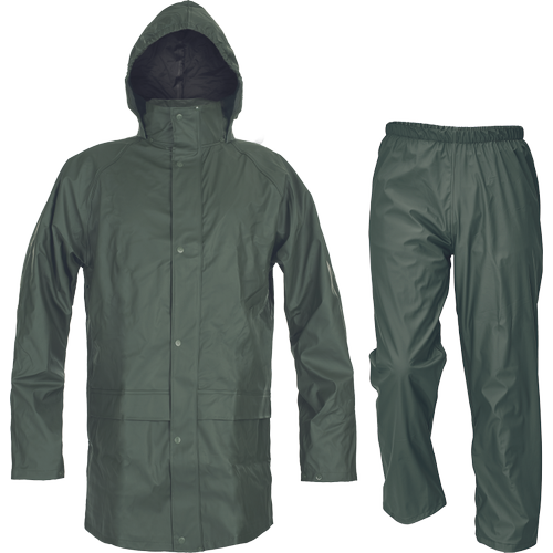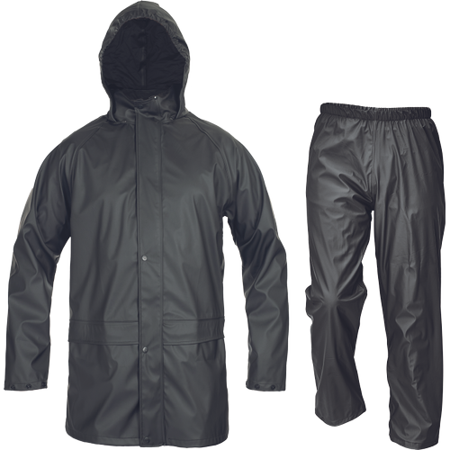 wodoodporny i wiatroszczelny komplet przeciwdeszczowy składający się z płaszcza ¾ z kapturem chowanym w kołnierzu oraz spodni z elastyczną gumą w pasie